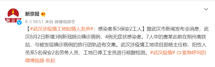 8月4日下午,重慶市奉節縣也報告了1例本地新冠肺炎無癥狀感染者與武漢沌口上述工地相關。