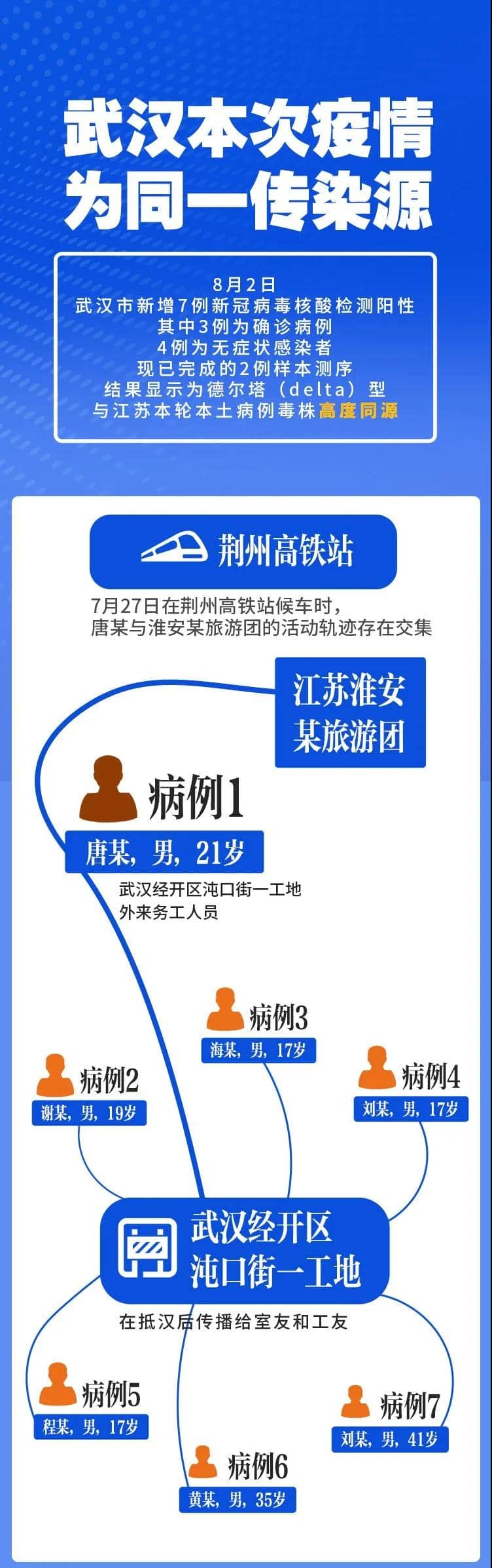 8月1日晚上,武漢經開區在對淮安某旅游團重點區域駐留人員排查中,發現沌口街一工地外來務工人員唐某,曾于7月27日在荊州高鐵站候車時,與淮安某旅游團的活動軌跡存在交集。8月2日上午,唐某及與其密接的6名人員核酸檢測陽性。同期,安徽一工地查出2名密接者軌跡,已追蹤隔離51人。