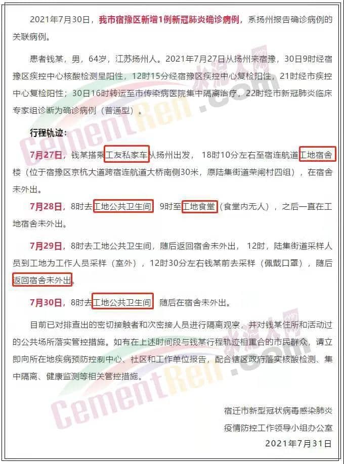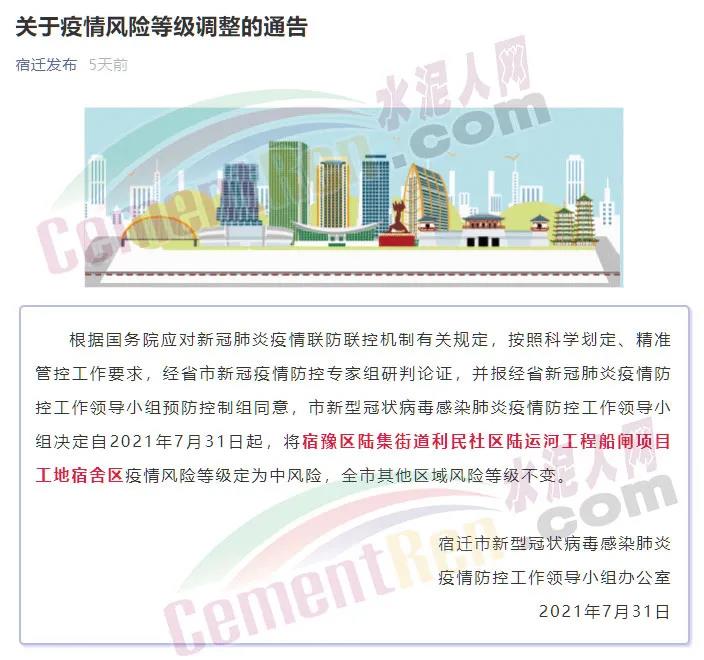 7月30日,江蘇宿遷一工地宿舍確診1例新冠肺炎病例,7月31日,將該宿舍區疫情風險等級定為中風險。