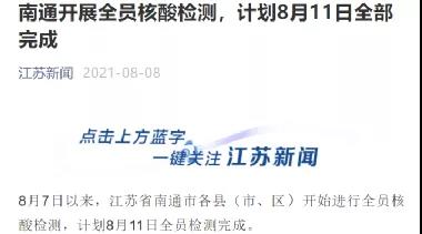 江蘇南通:8月7日以來,江蘇省南通市各縣(市)區開始進行全員核酸檢測,計劃8月11日全員檢測完成。
