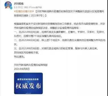 河南開封:自2021年8月8日起,將尉氏縣莊頭鎮前曹村、后曹村、于家村、文家村、劉家村、孫莊村、田家村等7個地區調整為高風險地區;除上述7個地區外,將尉氏縣莊頭鎮其他區域調整為中風險地區。對尉氏縣全域執行防控區管理,暫停與外界人員往來。
