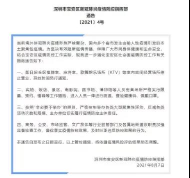 深圳市寶安區:即日起寶安區KTV、棋牌室等室內密閉經營場所停止營業。