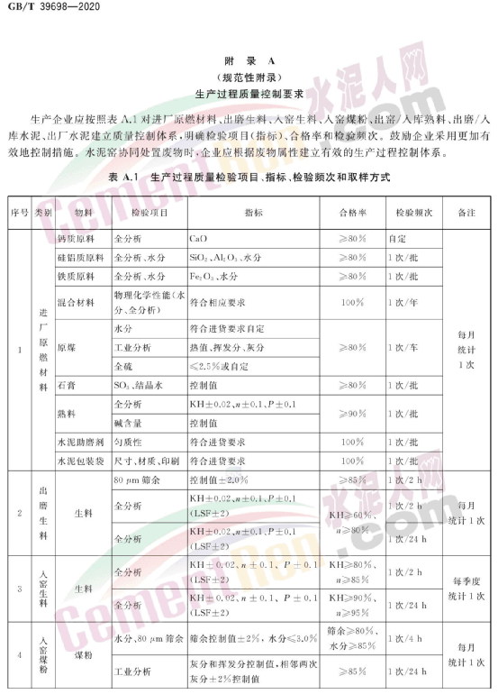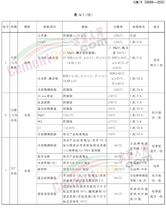 標準附錄中給出了出磨/入庫水泥以及出廠水泥質量檢驗項目、指標、檢驗頻次和取樣方式要求。