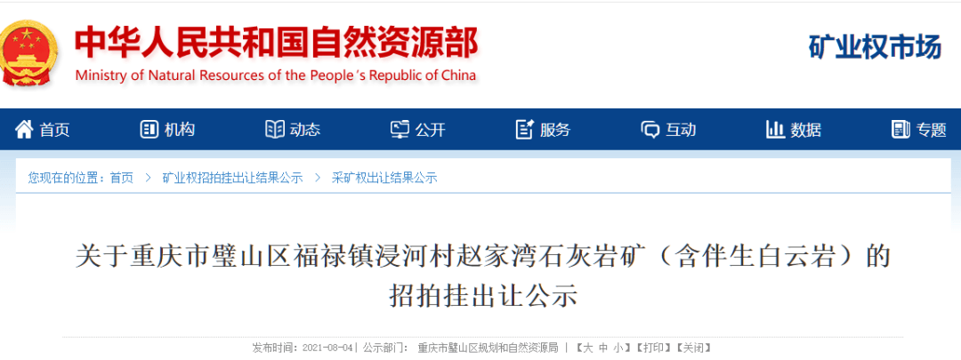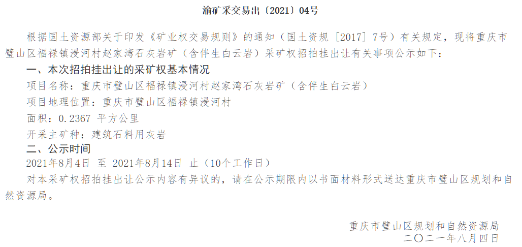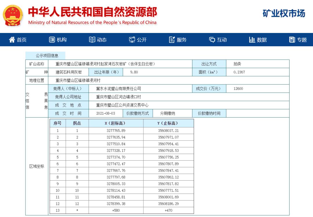 8月4日,中華人民共和國自然資源部發(fā)布《關(guān)于重慶市璧山區(qū)福祿鎮(zhèn)浸河村趙家灣石灰?guī)r礦(含伴生白云巖)的招拍掛出讓公示》。公示文件顯示,中標(biāo)人采礦權(quán)中標(biāo)人為冀東水泥璧山有限責(zé)任公司,成交價(jià)為12600萬元,成交時(shí)間為2021年8月3日。