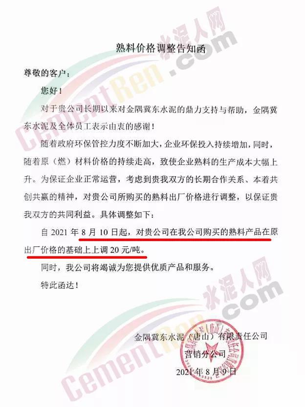 金隅冀東水泥唐山有限責任公司營銷分公司通知,隨著政府環保管控力度不斷加大,企業環保投入持續增加,同時,隨著原(燃)材料價格的持續走高,致使企業熟料的生產成本大幅上升。為保證企業正常運營,自8月10日起,對熟料產品在原出廠價格的基礎上上調20元/噸。
