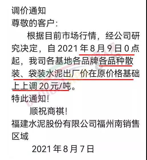 同日福建省內福建水泥、金牛水泥等多家企業通知自8月9日起上調水泥價格20元/噸。