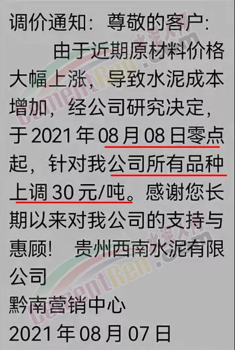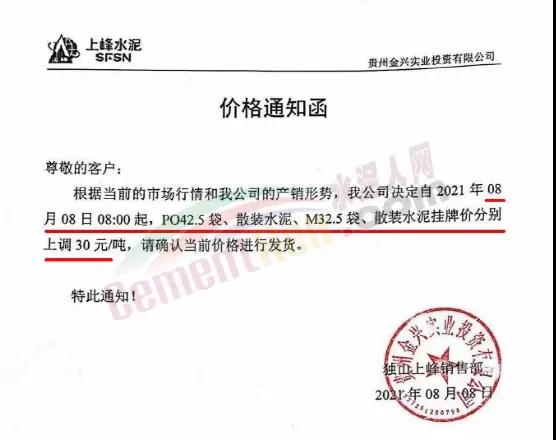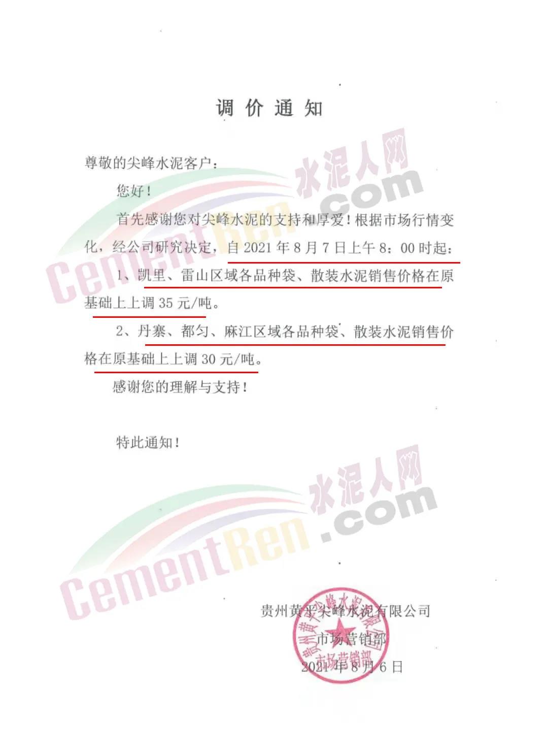 同日,企業又通知根據市場行情變化,經公司研究決定,自2021年8月7日上午8時起,凱里、雷山區域各品種袋、散裝水泥銷售價格在原基礎上上調35元/噸;丹寨、都勻、麻江區域各品種袋、散裝水泥銷售價格在原基礎上上調30元/噸。
