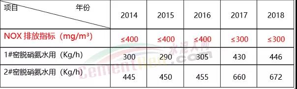日照中聯水泥擁有兩條2*2500t/d新型干法水泥熟料生產線,采用窯外預分解旋窯生產工藝。應環保要求,2014年日照中聯水泥增加SNCR脫硝系統降低NOX排放。使用初期,NOX排放指標為400mg/m³以下,脫硝氨水使用量1#窯約300Kg/h,2#窯約450Kg/h。在2017年NOX排放指標調整為300mg/m³以下,1#窯約430Kg/h,2#窯約650Kg/h,下表是2014年至2018年脫硝氨水消耗統計。