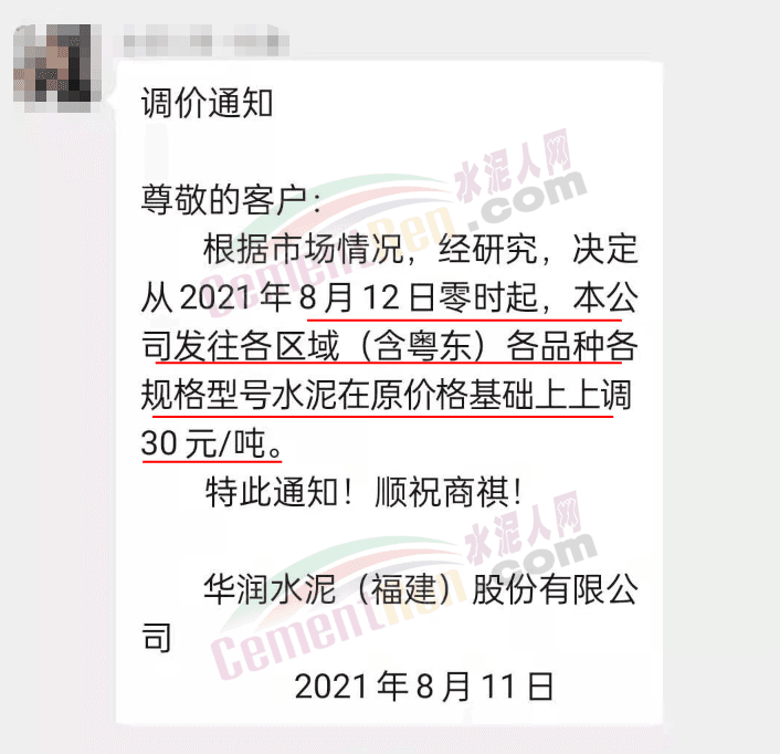 華潤(rùn)水泥(福建)股份有限公司通知,根據(jù)市場(chǎng)情況,經(jīng)研究決定從8月12日零時(shí)起,公司發(fā)往各區(qū)域(含粵東)各品種各規(guī)格型號(hào)水泥在原價(jià)格基礎(chǔ)上上調(diào)30元/噸。