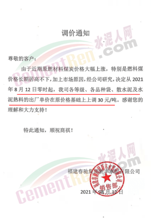 福建春馳集團(tuán)新豐水泥有限公司通知自8月12日零時(shí)起,公司各等級(jí)、各品種袋、散裝水泥及熟料在原價(jià)基礎(chǔ)上上調(diào)30元/噸。