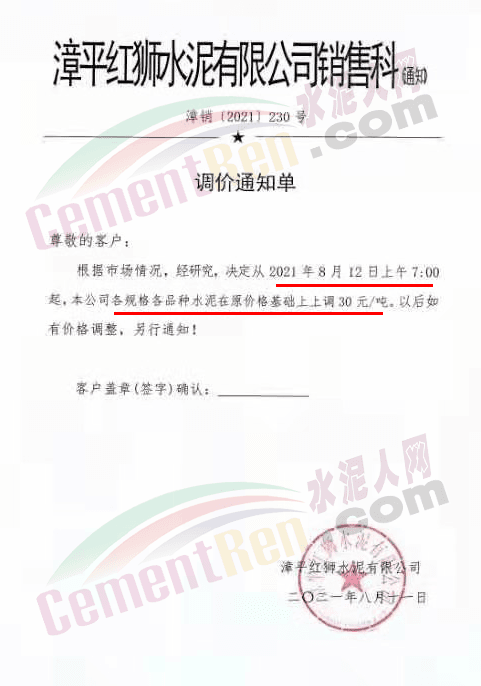 漳平紅獅水泥有限公司銷售科通知,根據(jù)市場(chǎng)情況,自8月12日上午7時(shí)起,公司各規(guī)格品種水泥在原價(jià)基礎(chǔ)上上調(diào)30元/噸。