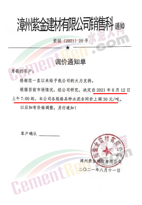 漳州紫金建材有限公司銷售科通知,根據(jù)目前市場(chǎng)情況,自8月12日上午7時(shí)起,公司各規(guī)格品種水泥合同價(jià)上調(diào)30元/噸。