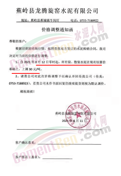 蕉嶺縣龍騰旋窯水泥有限公司通知自8月12日零時(shí)起,所有袋、散裝水泥在現(xiàn)有結(jié)算價(jià)基礎(chǔ)上上調(diào)30元/噸。