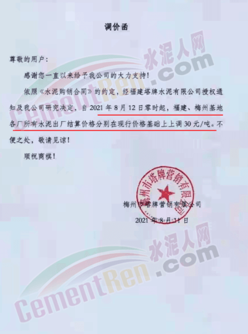 梅州市塔牌營(yíng)銷有限公司通知,經(jīng)福建塔牌水泥有限公司授權(quán)通知,自8月12日零時(shí)起,福建、梅州基地各廠所有水泥出廠結(jié)算價(jià)上調(diào)30元/噸。