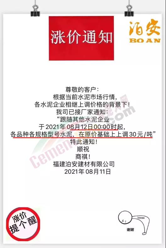 福建泊安建材通知,根據(jù)當(dāng)前水泥市場(chǎng)行情,各水泥企業(yè)相繼上調(diào)價(jià)格的背景下,公司已經(jīng)接廠家通知,跟隨其他水泥企業(yè)于8月12日0時(shí)起各品種各規(guī)格型號(hào)水泥,在原價(jià)基礎(chǔ)上上調(diào)30元/噸。