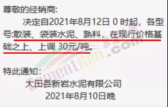 8月10日晚大田縣新巖水泥有限公司通知,自8月12日0時(shí)起各型號(hào)散裝、袋裝水泥、熟料,在現(xiàn)行價(jià)格基礎(chǔ)之上上調(diào)30元/噸。
