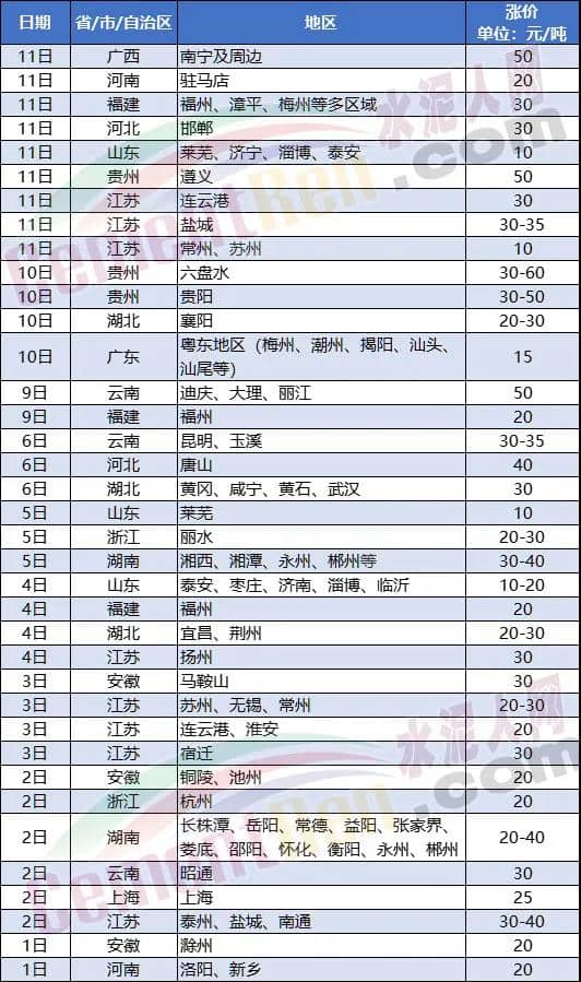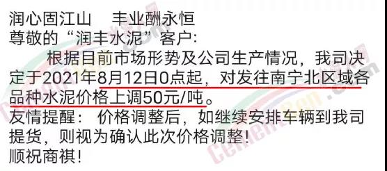 同日,興業(yè)海螺水泥通知自8月11日早8時(shí)起,廣西區(qū)域海螺水泥各品種規(guī)格上調(diào)50元/噸。