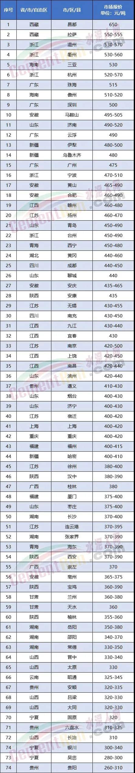 從水泥人網(wǎng)信息中心近期重點(diǎn)監(jiān)控的的70多個(gè)區(qū)域市場(chǎng)報(bào)價(jià)來(lái)看,除西藏昌都報(bào)價(jià)650元/噸外,相對(duì)較高報(bào)價(jià)仍在浙江地區(qū),浙江溫州最高報(bào)價(jià)達(dá)到570元/噸。