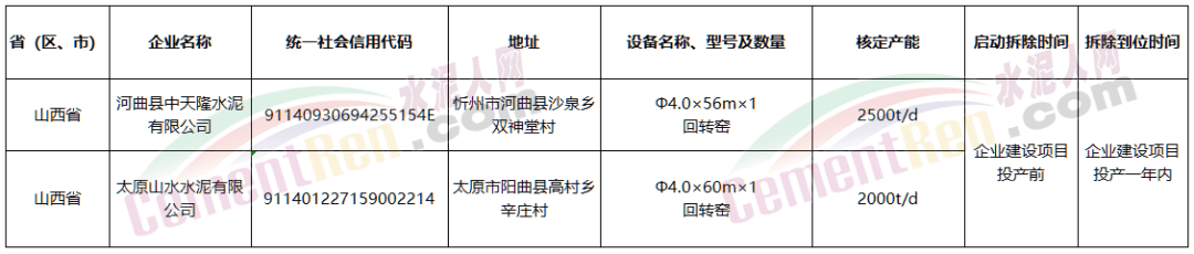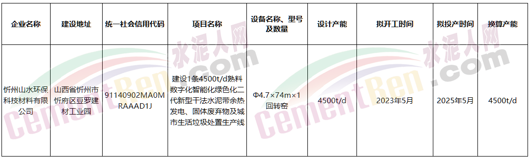 日前,山西省工業和信息化廳發布《山西山水水泥有限公司產能情況公示》提到:擬將山西河曲縣中天隆水泥有限公司2500t/d和太原山水水泥有限公司2000t/d水泥熟料產能將退出。用于忻州山水環??萍疾牧嫌邢薰驹谏轿魇⌒弥菔行酶畢^豆羅建材工業園建設1條4500t/d熟料數字化智能化綠色化二代新型干法水泥帶余熱發電、固體廢棄物及城市生活垃圾處置生產線。開工時間擬定為2023年5月,擬投產時間為2025年5月。 退出產能清況 建設項目情況