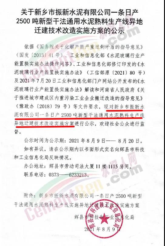 日前,河南新鄉輝縣市人民政府發布《關于新鄉市振新水泥有限公司一條日產2500噸新型干法通用水泥熟料生產線異地遷建技術改造實施方案的公示》。