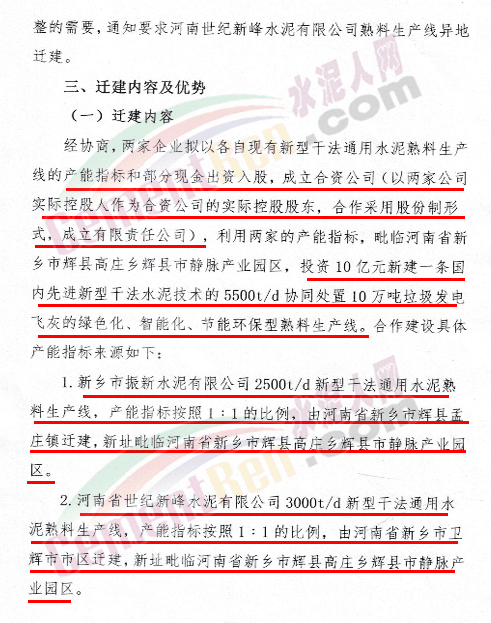 公示文件提到,新鄉市振新水泥有限公司與河南世紀新峰水泥有限公司擬投資10億元,以各自現有的通用水熟料生產線的產能指標和部分現金出資入股后成立合資公司,同時利用兩家現有通用水泥熟料產能指標,在毗臨輝縣市靜脈產業園區“拆二合一”,不擴產能地技改合并建設一條5500t/d國內先進的新型干法水泥技術協同處置10萬噸垃圾發電飛灰的綠色化、智能化、節能環保型熟料生產線項目。