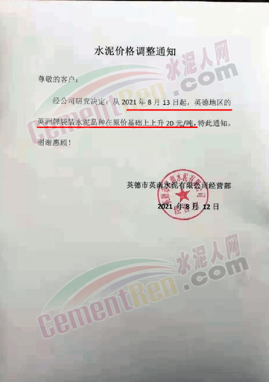 廣東省英紅華僑水泥廠通知,自8月13日8時起P.C42.5及P.P32.5R包裝水泥對英德地區上調20元/噸。