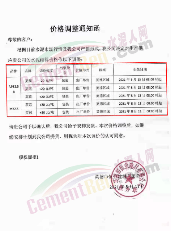 英德市恒業建材有限公司通知,自8月13日8時起旗下英翔、英冠、英聯品牌P.P32.5R包裝水泥及英聯、英冠品牌M32.5包裝水泥出廠價上調20元/噸。