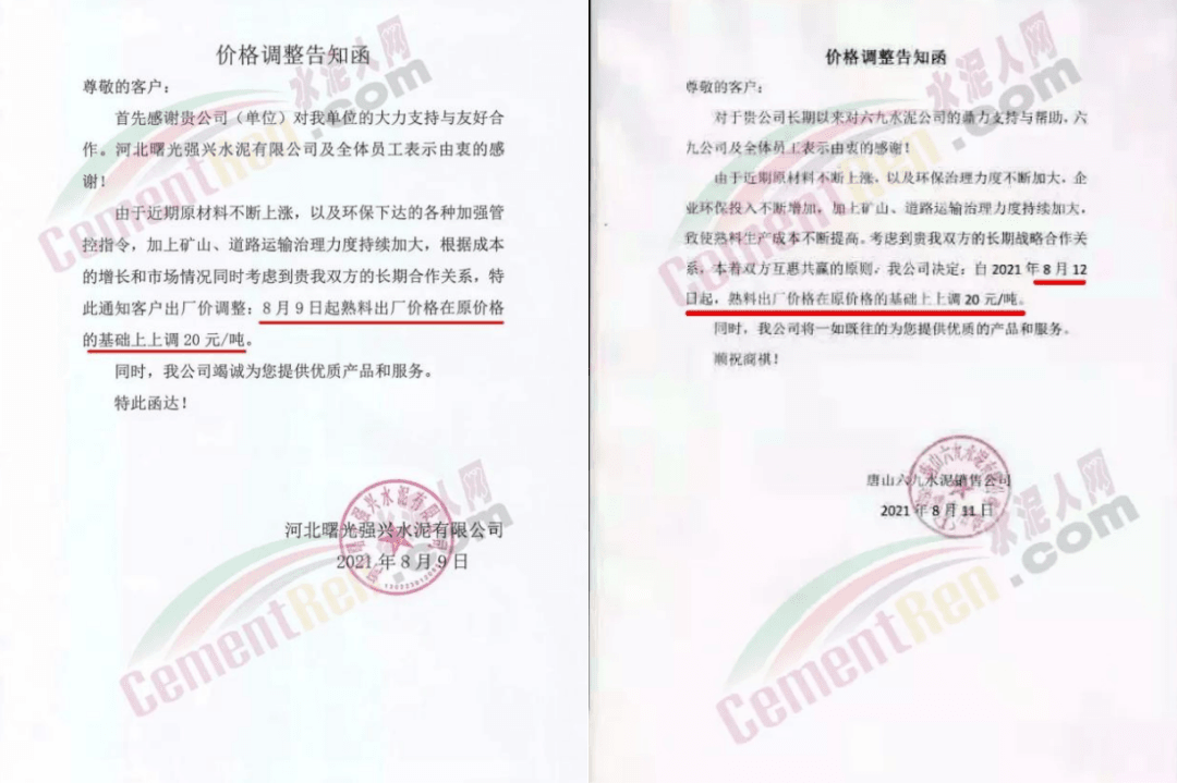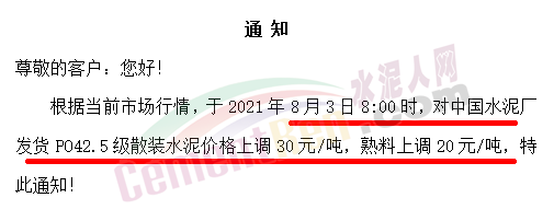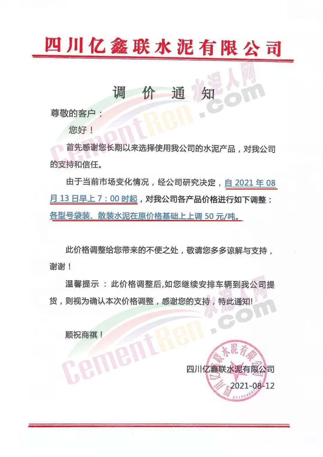 同期,水泥價格也出現跟漲。8月12日四川億鑫聯水泥有限公司通知,由于當前市場變化情況,經公司研究決定,自8月13日旱上7時起,對公司袋裝、散裝水泥在原價格基礎上上調50元/噸。價格調整后,如您繼續安排車輛到公司提貨,則視為確認本次價格調整。