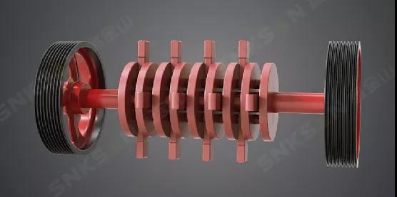 轉子錘頭由傳統的50-70件降低至16-20件,降低了轉子自重以及易損件數量。轉子兩側設置大慣量皮帶輪,增加了轉子的運轉慣性,降低了負載率。