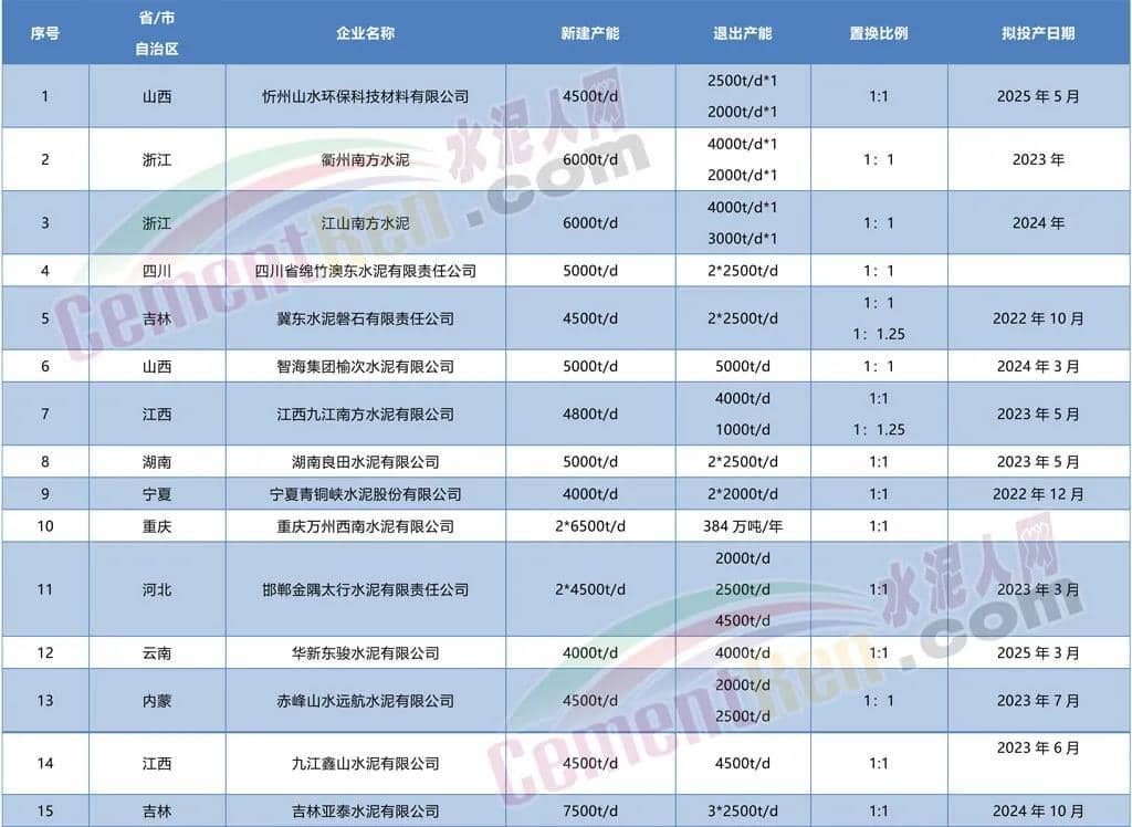 綜合上述置換內(nèi)容,以1:1比例遷建的項(xiàng)目涉及15家水泥企業(yè)17條熟料生產(chǎn)線(xiàn)新建產(chǎn)能合計(jì)2613萬(wàn)噸/年,退出生產(chǎn)線(xiàn)達(dá)28條。