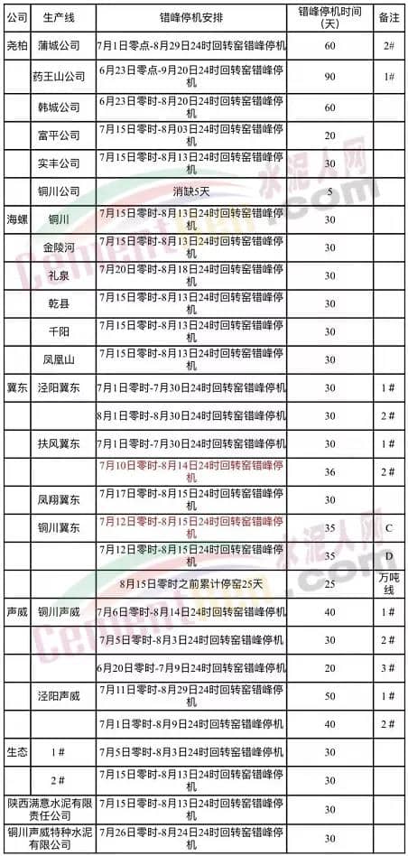 《通知》結(jié)合陜西省水泥行業(yè)運行規(guī)律和各企業(yè)實際情況制定了具體的“水泥熟料生產(chǎn)線錯峰生產(chǎn)計劃表”,要求關(guān)中地區(qū)堯柏、海螺、冀東、聲威等29條水泥熟料生產(chǎn)線自6月20日零時起安排錯峰停產(chǎn),最高停產(chǎn)90天。其中銅川冀東萬噸線于8月15日零時之前累計停窯25天。