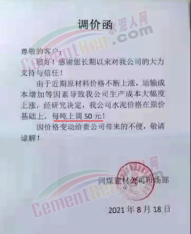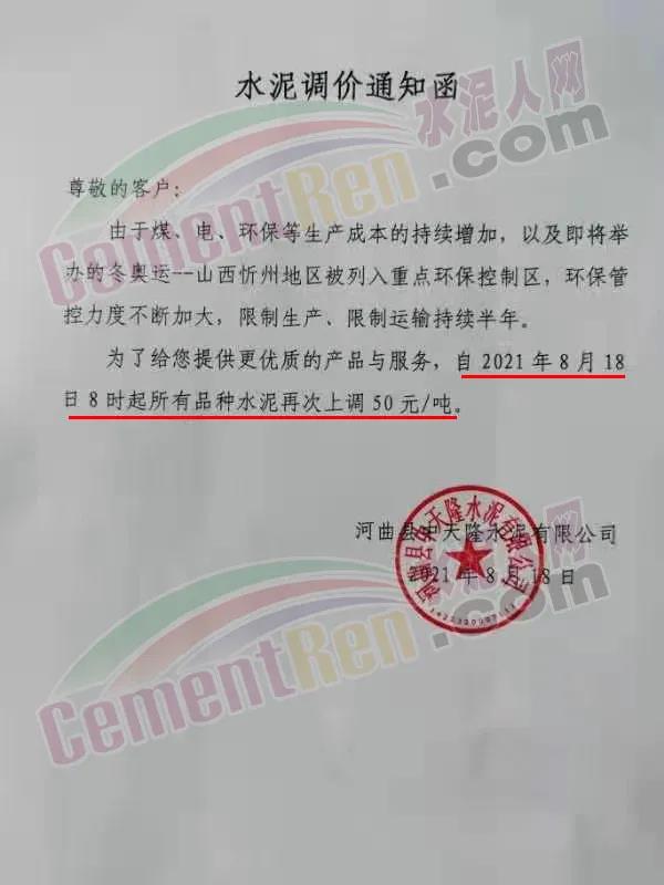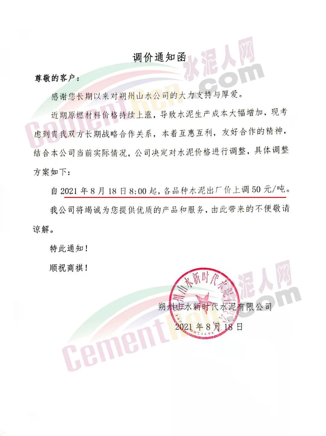 昨日(8月18日)朔州山水新時代水泥有限公司通知,近期原燃材料價格持續上漲,導致水泥生產成本大幅增加,自2021年8月18日8時起,各品種水泥出廠價上調50元/噸。
