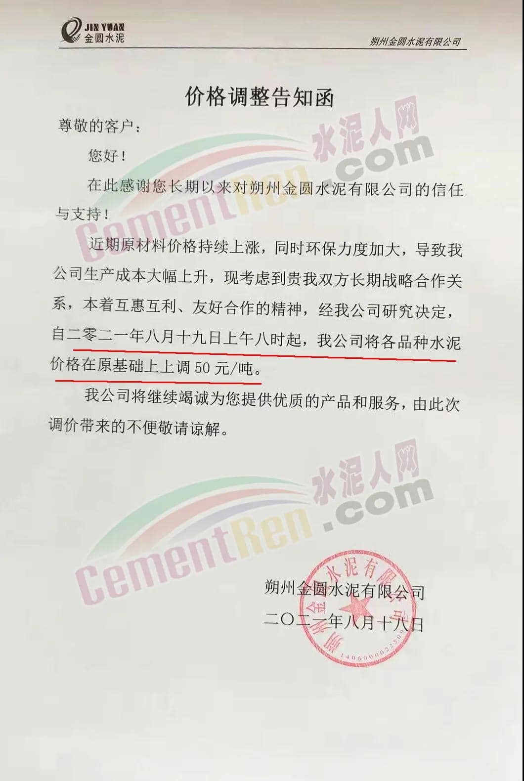 朔州金圓水泥有限公司通知近期原材料價格持續上漲,同時環保力度加大,導致公司生產成本大幅上升,經公司研究決定,自2021年8月19日上午8時起,將各品種水泥價格在原基礎上上調50元/噸。