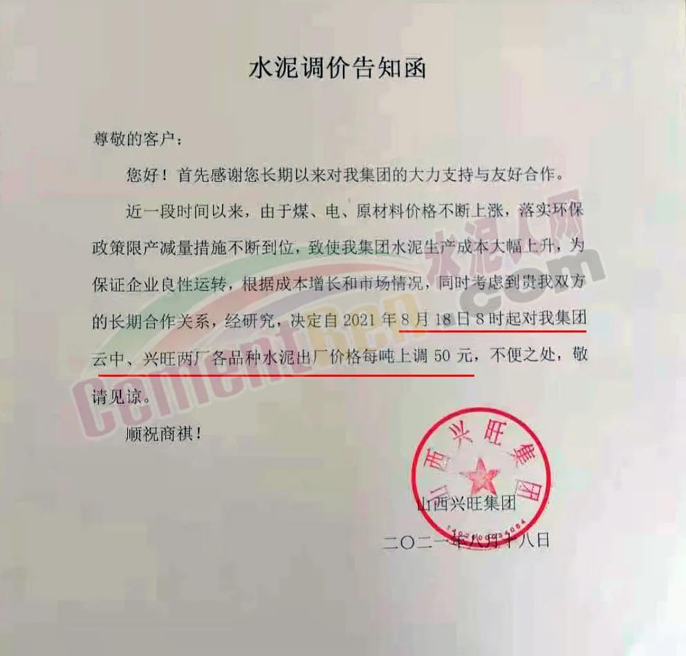 山西興旺集團通知稱,近一段時間以來,由于煤、電、原材料價格不斷上漲,落實環保政策限產減量措施不斷到位,致使企業水泥生產成本大幅上升,為保證企業良性運轉,根據成本增長和市場情況,經研究決定自2021年8月18日8時起對集團云中、興旺兩廠各品種水泥出廠價格上調50元/噸。