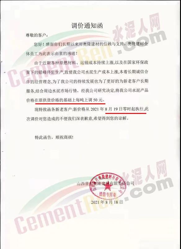 山西晉興奧隆建材有限責任公司通知,由于近期各種原燃材料、運輸成本持續上漲,以及在國家環保政策下的錯峰停窯生產,致使公司水泥生產成本上漲,結合周邊水泥市場行情,經公司研究決定,將水泥產品價格在原供貨價格的基礎上上調50元/噸,新價格從2021年8月19日零時起執行。