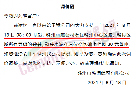 同日,江西贛州市贛鼎建材有限公司通知自2021年8月18日8時起,贛州海螺公司發往贛州中心區域、贛縣區域所有等級的袋裝,散裝水泥在原價格基礎上上調30元/噸。
