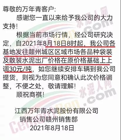 江西萬年青水泥股份有限公司銷售公司贛州銷售部通知根據當前市場行情,經公司研究決定,自2021年8月18日8時起,公司各基地發往贛州城區區域市場各品種袋裝及散裝水泥出廠價格在原價格基礎上上調30元/噸。
