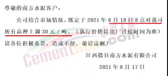 江西贛縣南方水泥有限公司通知于2021年8月18日8點對公司所有品種上調30元/噸。