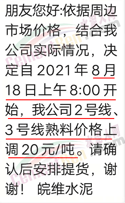 皖維水泥通知,依據周邊市場價格,結合公司實際情況,決定自2021年8月18日上午8時開始,公司2號線、3號線熟料價格上調20元/噸。