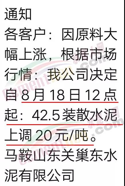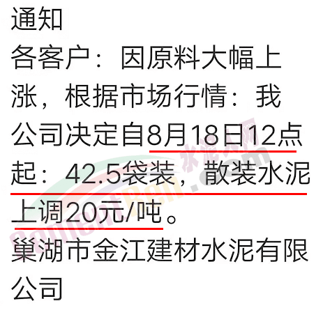 巢湖市金江建材水泥有限公司通知稱,因原料大幅上漲,根據市場行情公司決定自8月18日12點起42.5袋裝,散裝水泥上調20元/噸。