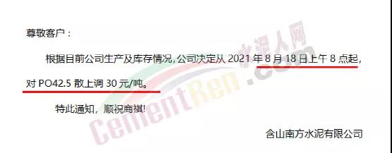 含山南方水泥有限公司通知根據目前公司生產及庫存情況公司決定從2021年8月18日上午8點起,對PO42.5散上調30元/噸。