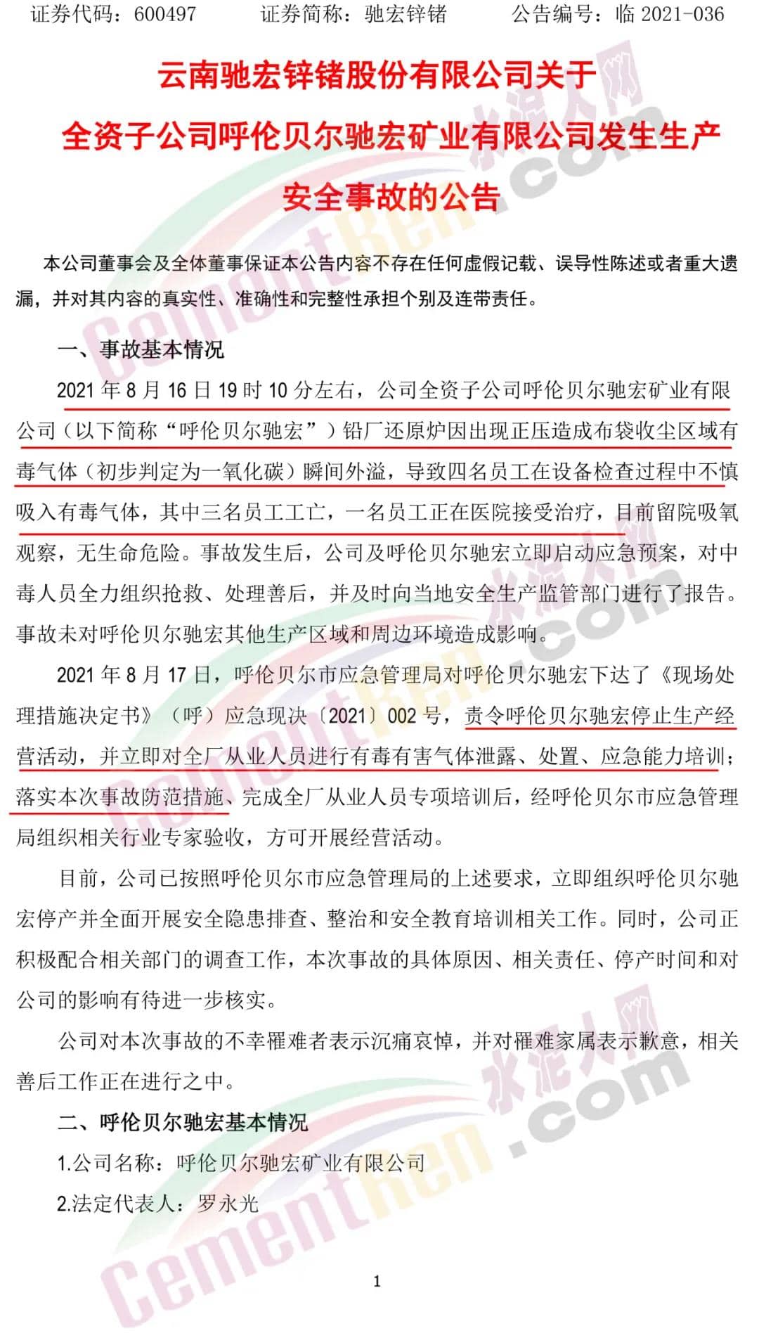 8月17日晚間,云南馳宏鋅鍺股份有限公司(600497.SH)發布公告稱,日前,全資子公司呼倫貝爾馳宏礦業有限公司出現有毒氣體外溢,致三名員工工亡,一名員工正在醫院接受治療,無生命危險,全資子公司目前停產整治。