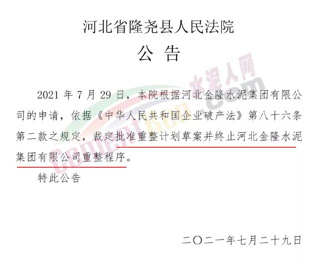 河北省隆堯縣人民法院發(fā)布公告稱,根據(jù)河北金隆水泥集團(tuán)有限公司的申請(qǐng),依據(jù)《中華人民共和國(guó)企業(yè)破產(chǎn)法》第八十六條第二款之規(guī)定,裁定批準(zhǔn)重整計(jì)劃草案并終止河北金隆水泥集團(tuán)有限公司重整程序。