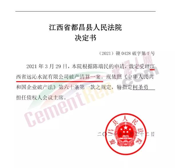 同期,江西省都昌縣人民發(fā)院發(fā)布決定書(shū),稱裁定受理江西省遠(yuǎn)沁水泥有限公司破產(chǎn)清算案。
