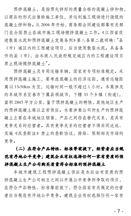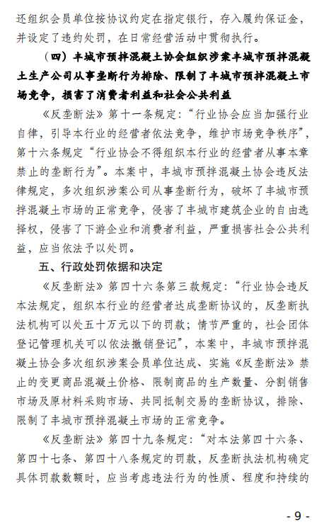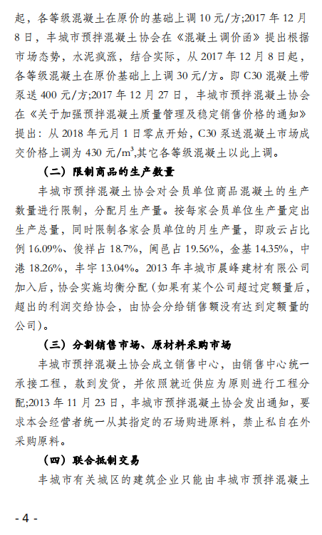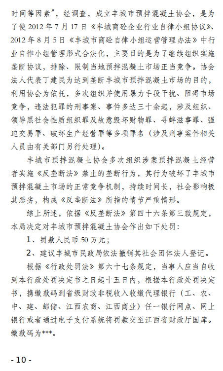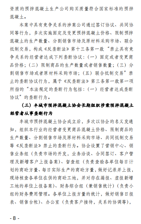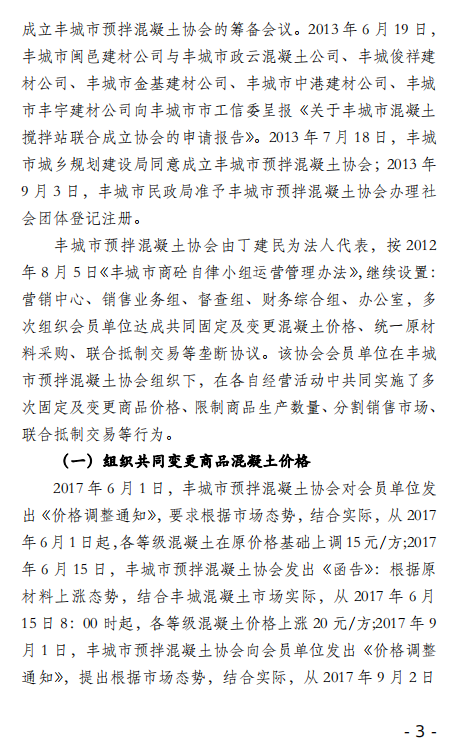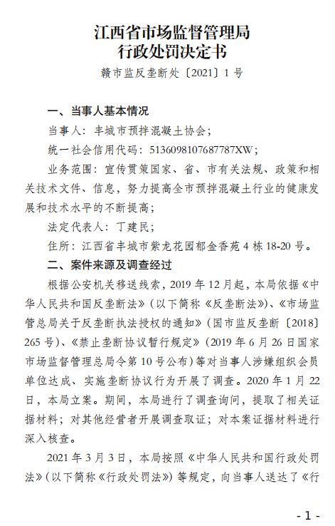 日前,江西省市場監管局發布《豐城市預拌混凝土協會及其會員企業壟斷協議案的處罰決定》根據公安機關移交線索,江西省市場監督管理局于2020年1月對豐城市預拌混凝土協會及其8家會員企業涉嫌壟斷協議行為立案調查。