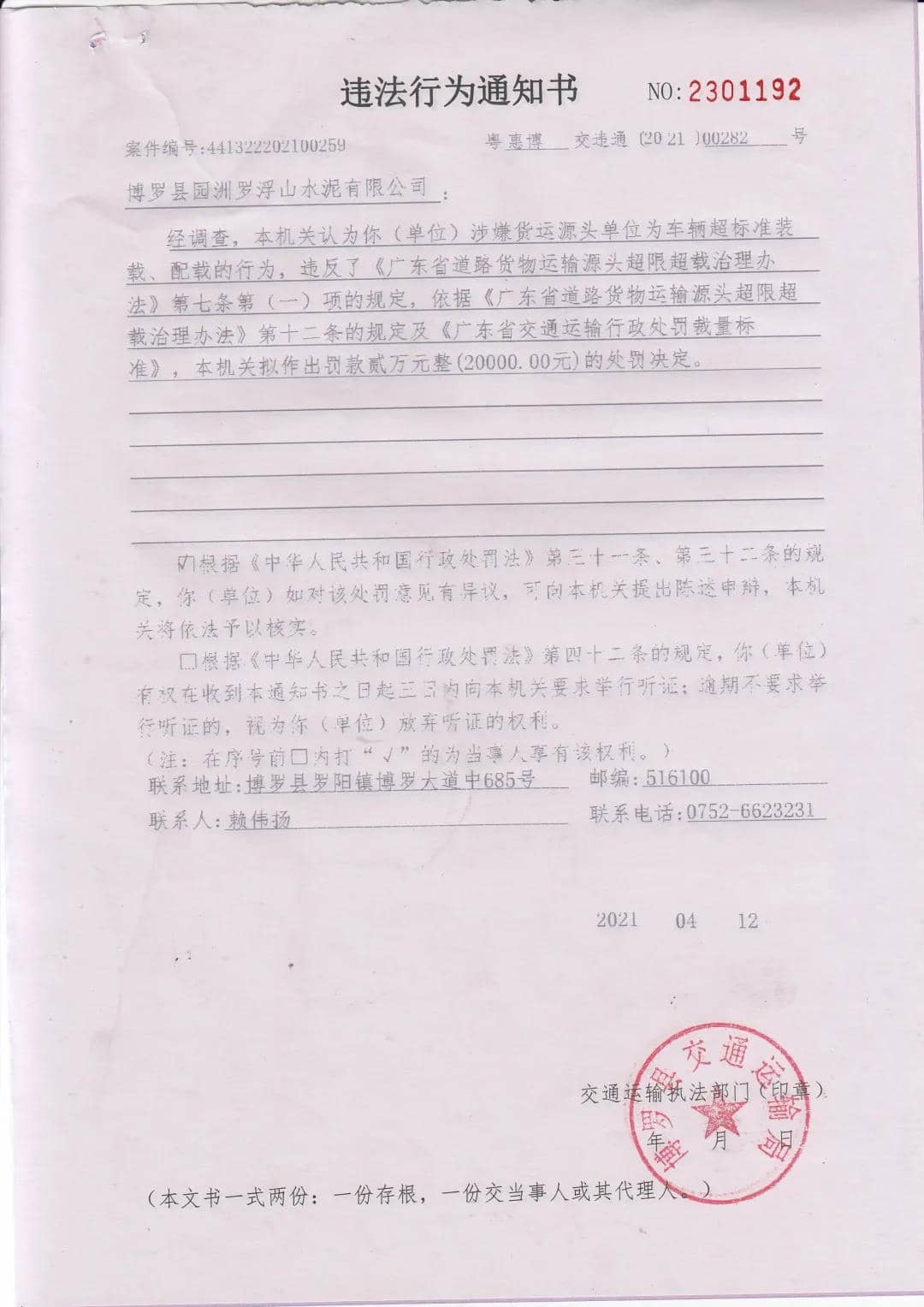 經(jīng)本機(jī)關(guān)依法查明,認(rèn)為你(單位)涉嫌貨運(yùn)源頭單位為車輛超標(biāo)準(zhǔn)裝載、配載的行為,違反了《廣東省道路貨物運(yùn)輸源頭超限超載治理辦法》第七條第(一)項(xiàng)的規(guī)定,依據(jù)《廣東省道路貨物運(yùn)輸源頭超限超載治理辦法》第十二條的規(guī)定及《廣東省交通運(yùn)輸行政處罰裁量標(biāo)準(zhǔn)》,本機(jī)關(guān)擬作出罰款貳萬(wàn)元整(20000.00元)的處罰決定。因其他法定方式無(wú)法送達(dá),現(xiàn)依法向你單位公告送達(dá)《違法行為通知書》(惠博交字【2021】00282號(hào)),自公告之日起60日內(nèi)來(lái)我局(博羅縣羅陽(yáng)街道辦事處博羅大道中685號(hào))簽收,逾期視為送達(dá)。