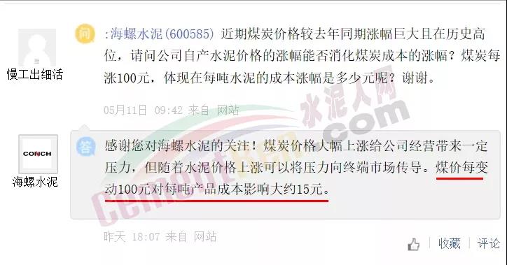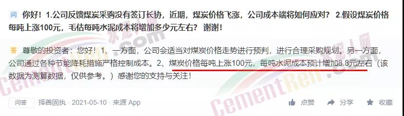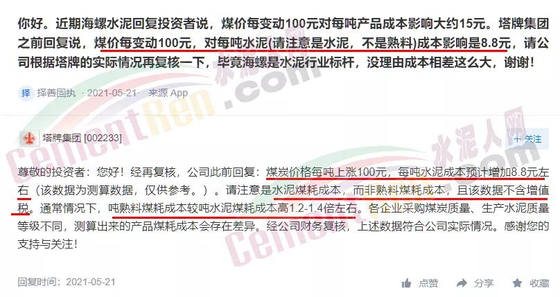 塔牌管理層則表示:煤炭價格每噸上漲100元,每噸水泥成本預計增加8.8元左右。且各企業(yè)采購煤炭質(zhì)量、生產(chǎn)水泥質(zhì)量等級不同,測算出來的產(chǎn)品煤耗成本會存在差異。