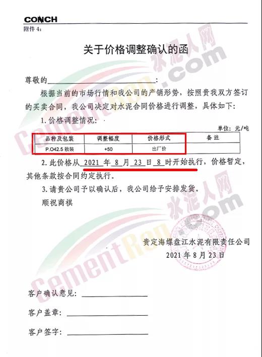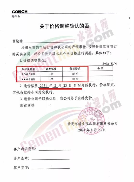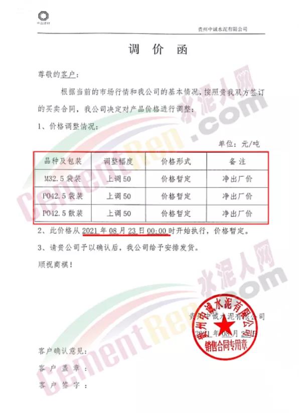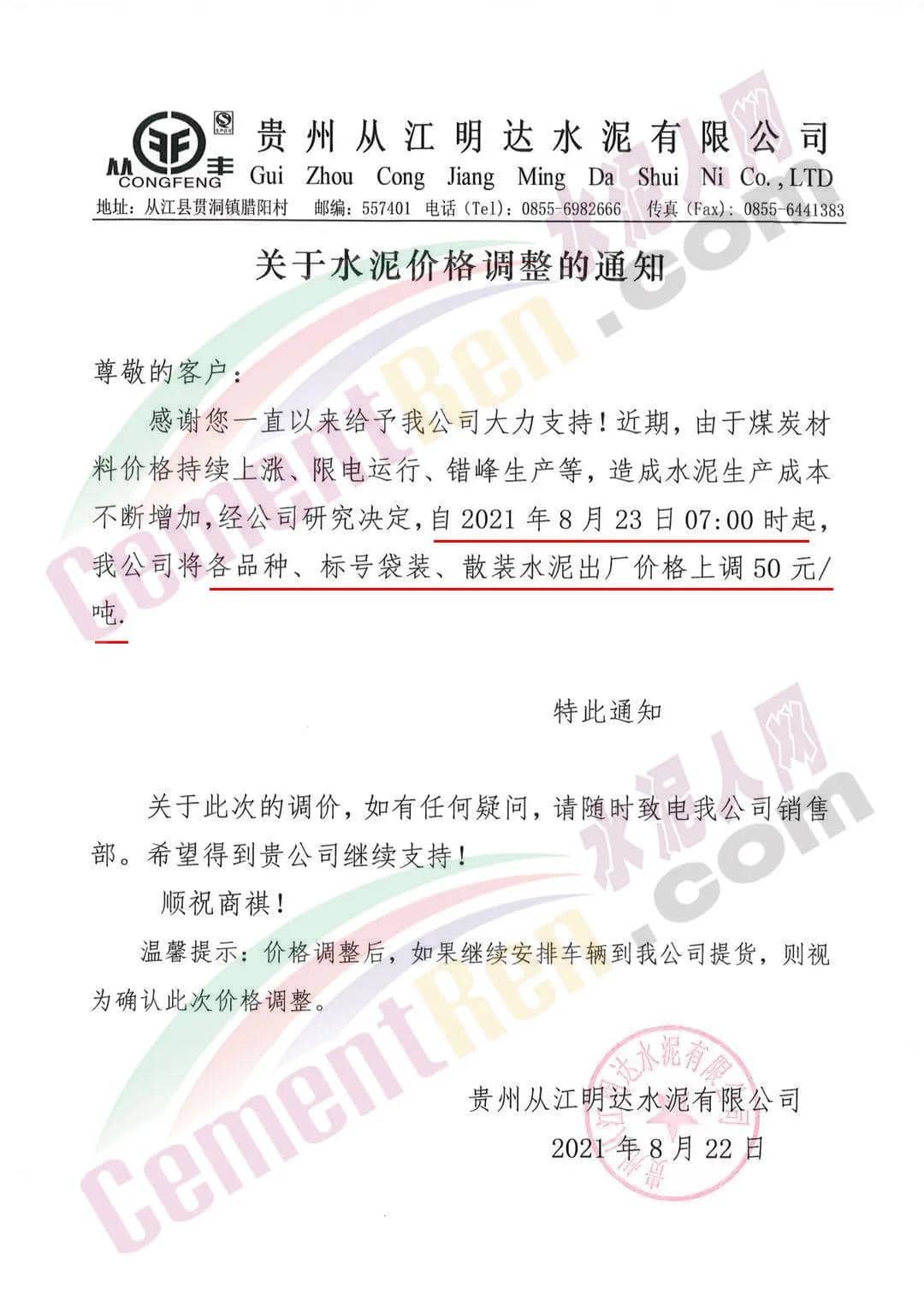 貴州從江明達水泥有限公司通知,由于煤炭材料價格持續(xù)上漲、限電運行、錯峰生產(chǎn)等,造成水泥生產(chǎn)成本不斷增加,經(jīng)公司研究決定,自8月23日7時起公司將各品種、標號袋裝、散裝水泥出廠價上調(diào)50元/噸。價格調(diào)整后,如繼續(xù)安排車輛到公司提貨,則視為確認此次價格調(diào)整。