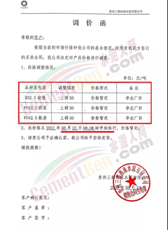 貴州三都西南水泥通知自8月23日0時起上調(diào)旗下各標號水泥50元/噸。