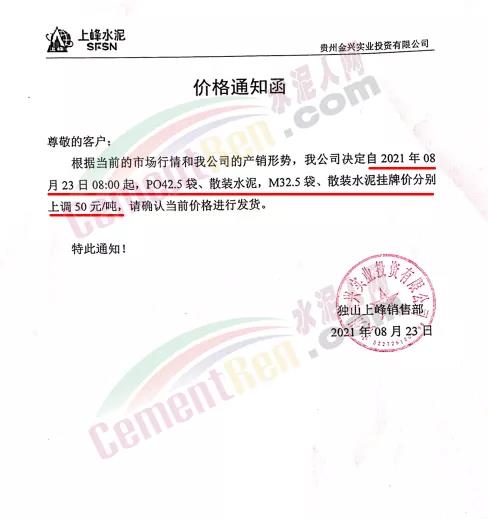 獨山上峰銷售部通知,自8月23日0時起,各標號水泥上調(diào)50元/噸。